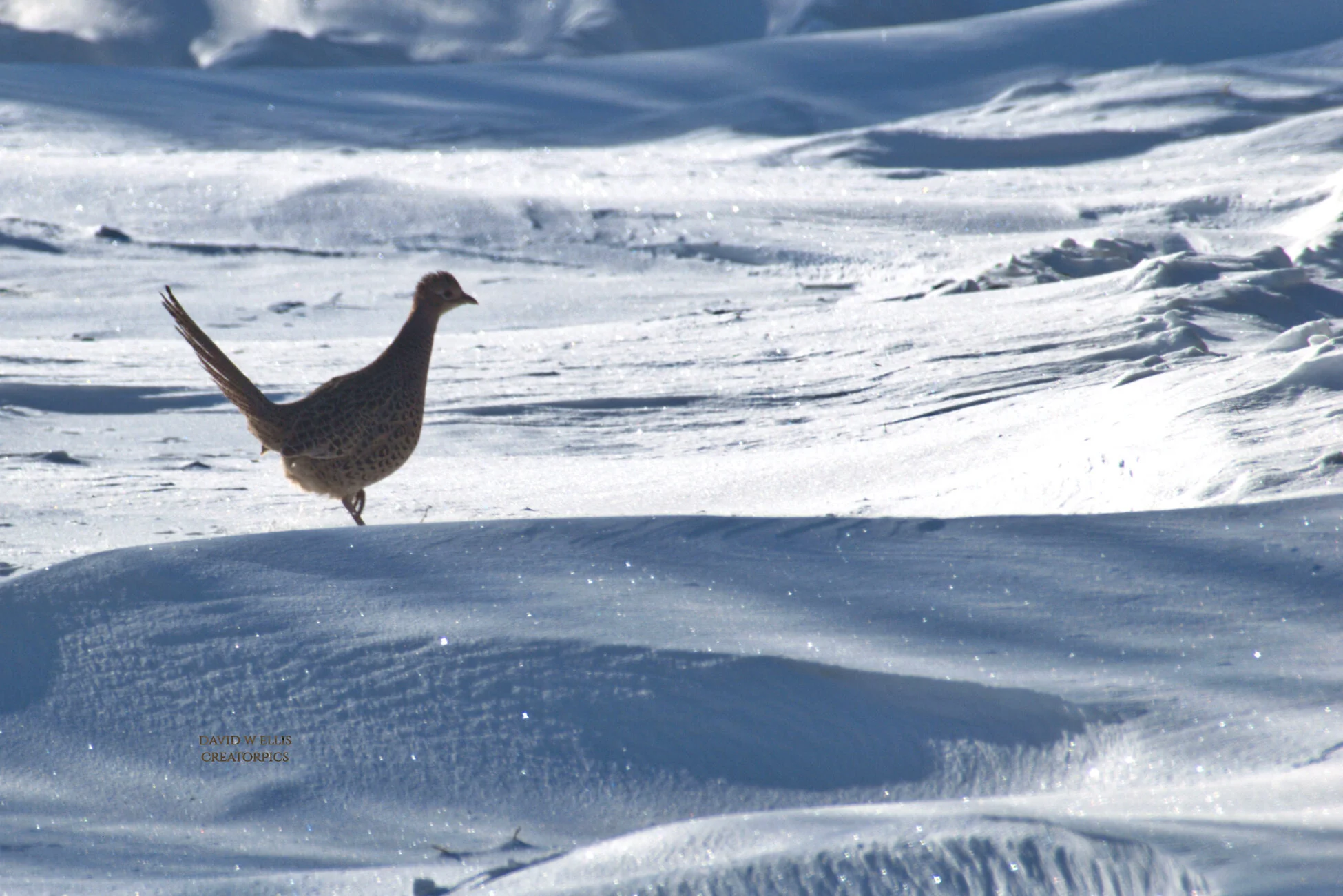 Pheasants feeding, eating gravel hours before in cold sunshine.