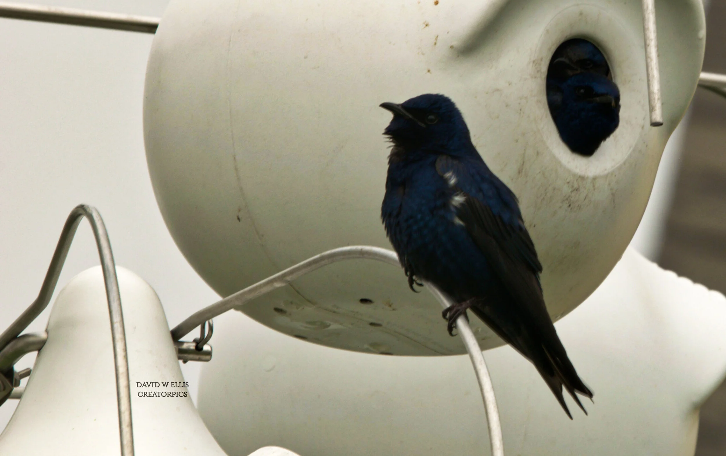 The Purple ..relies entirely on nest structures put up for them by humans. (No, this is not a great bird photo…but the beauty of the Purple Martin is evident.)