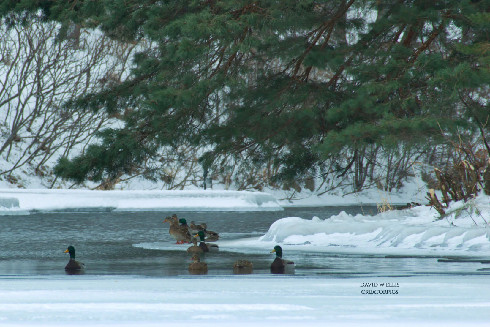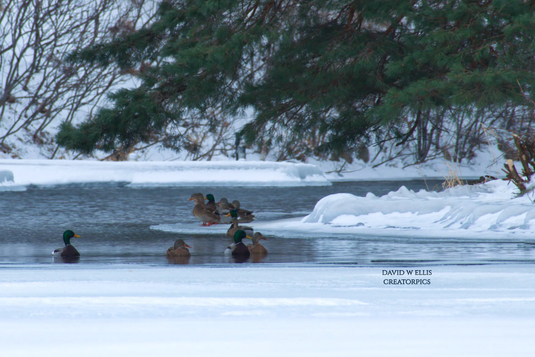 I used a telephoto lens. The ice where I took the photo is 12 inches thick…very safe ice. But obviously, not safe where the mallards swim!