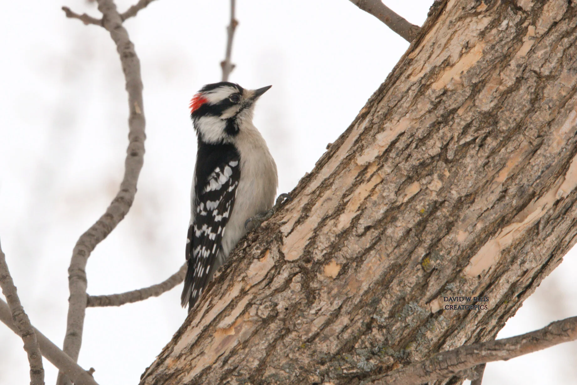 Black-capped Chickadees share feeder space with other birds. This male Downy Woodpecker paused to examine the top of the bird feeder where the suet is fastened. A moment later he was on the suet.