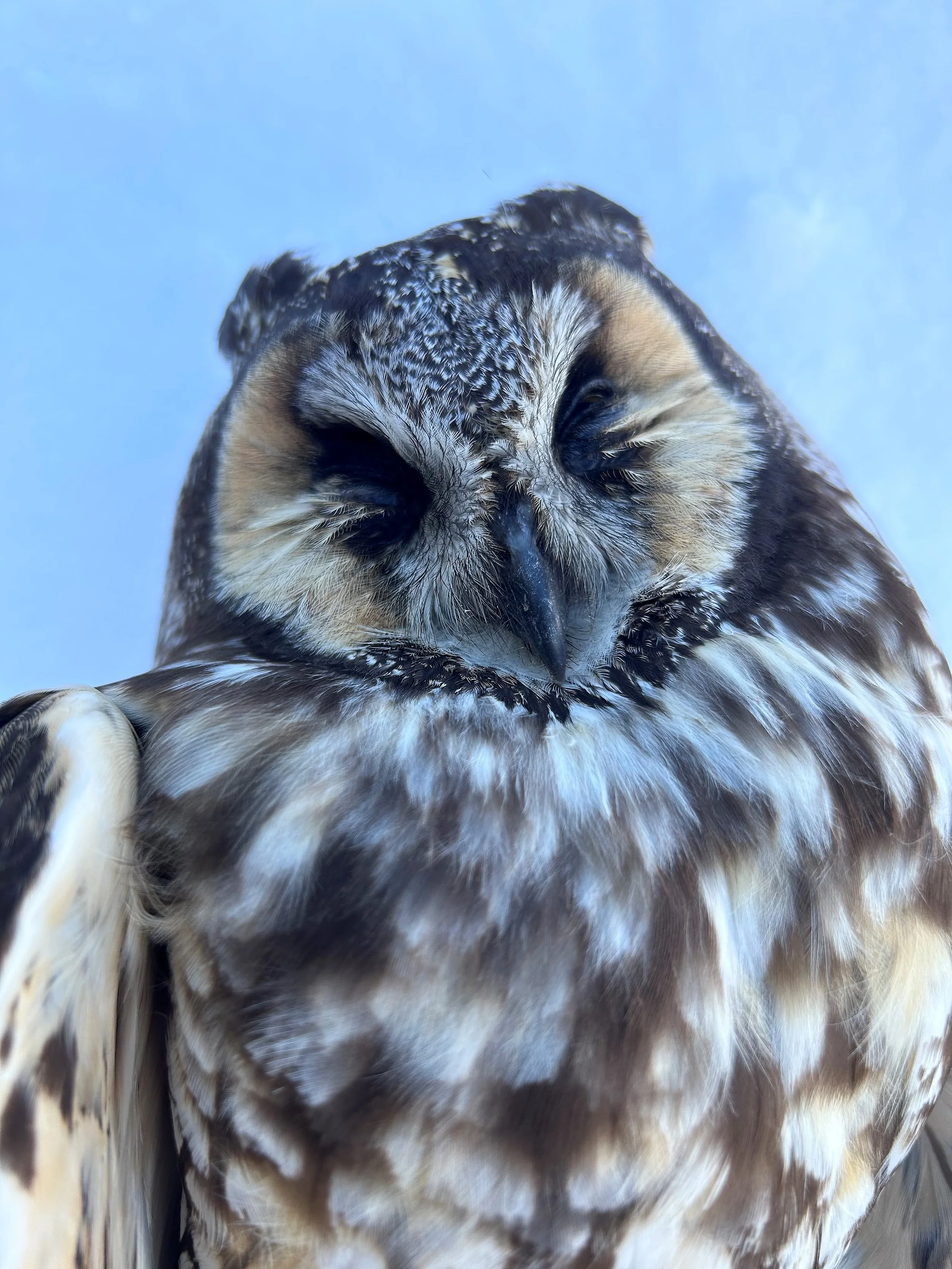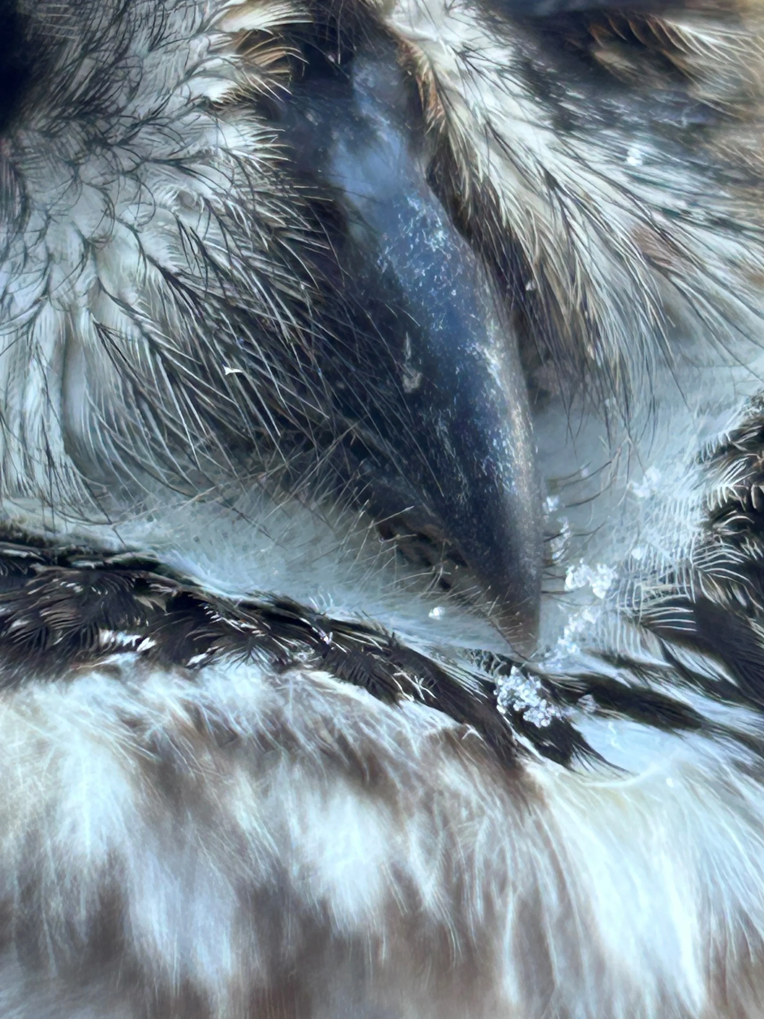 Upon picking it up, my mistake was clear. It was too small. Great horned have much thicker feather tufts which resemble ears than this bird did. This bird was missing the tuft on the right side of its head. But size and long shape confirmed the bird was a long-eared owl. Holding the beautiful bird in my gloved hands brought sadness and regret. Over and over the marvel of its feather patterns and symmetry impressed upon me that this bird was like all other birds a true miracle. After taking photos of it, we properly disposed of the bird, first choice was burial of the bird had the ground been unfrozen.